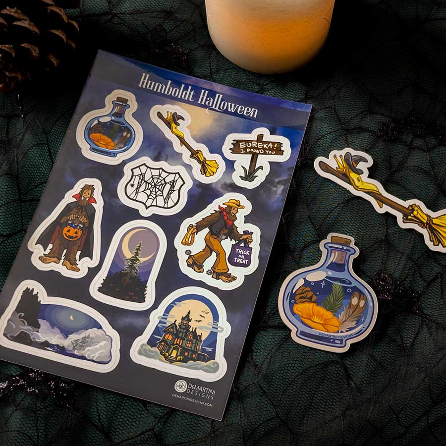 Spinning display of postcards, prints, and stickers.