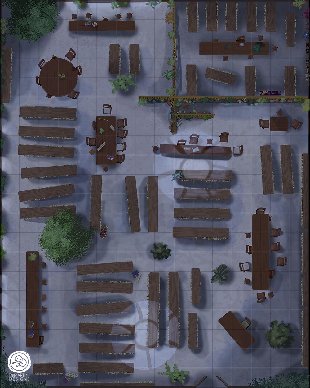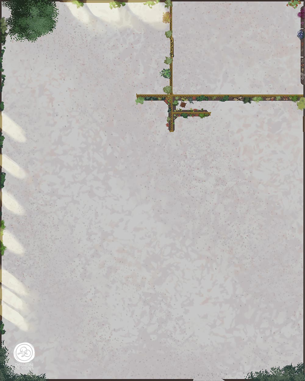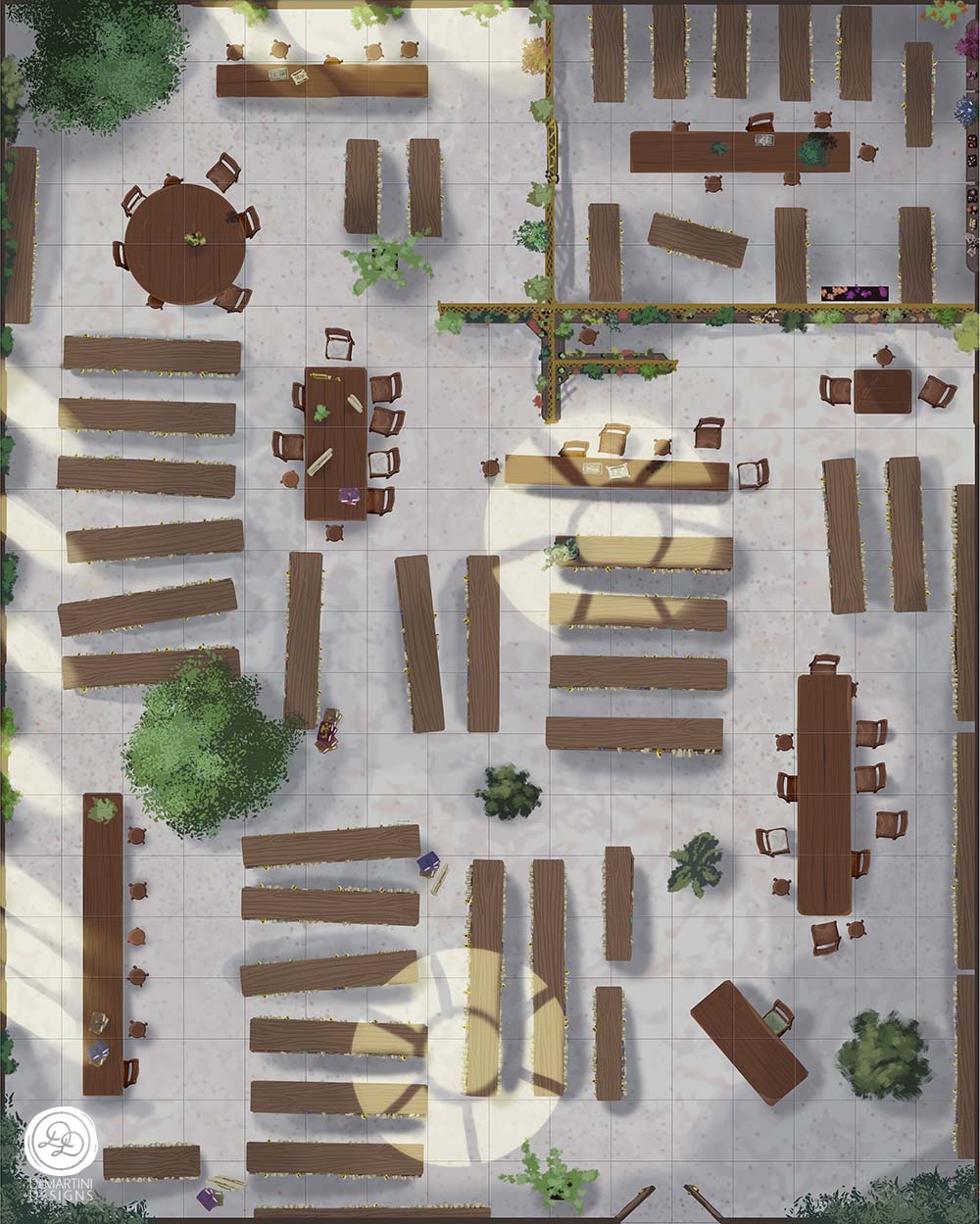 Towards the back there are metal lattice walls with shelves of plant samples and potted starters. Upon closer inspection, these walls house a separate area: a gated room with unusually colored leaves and more books and scrolls.