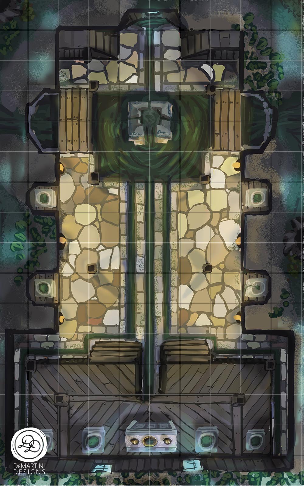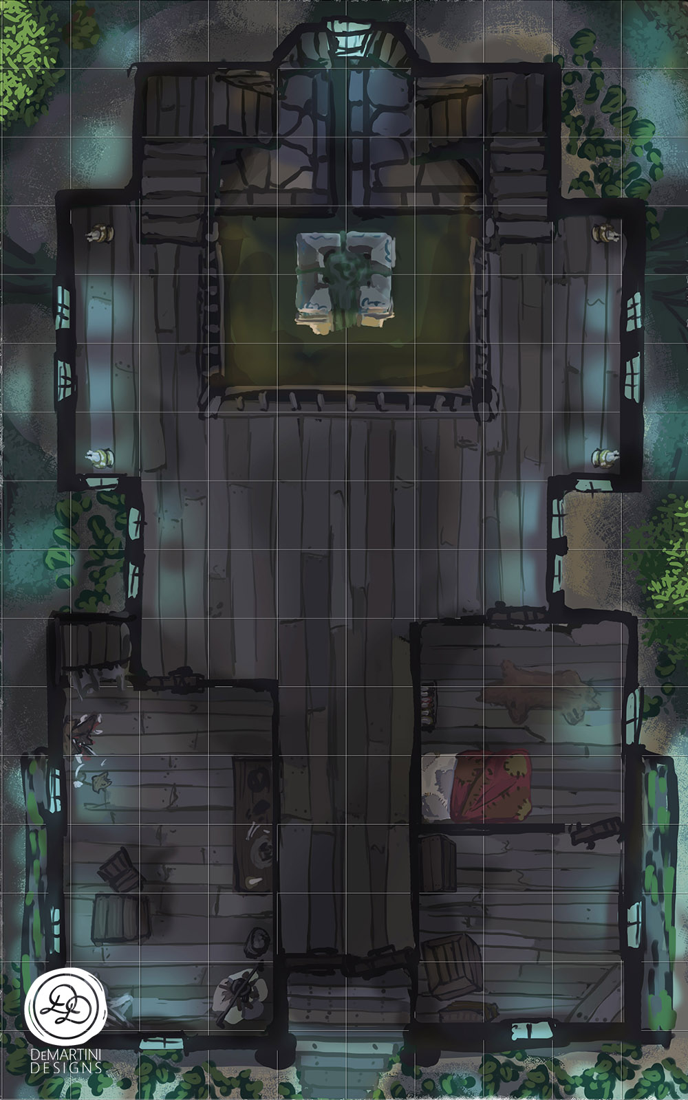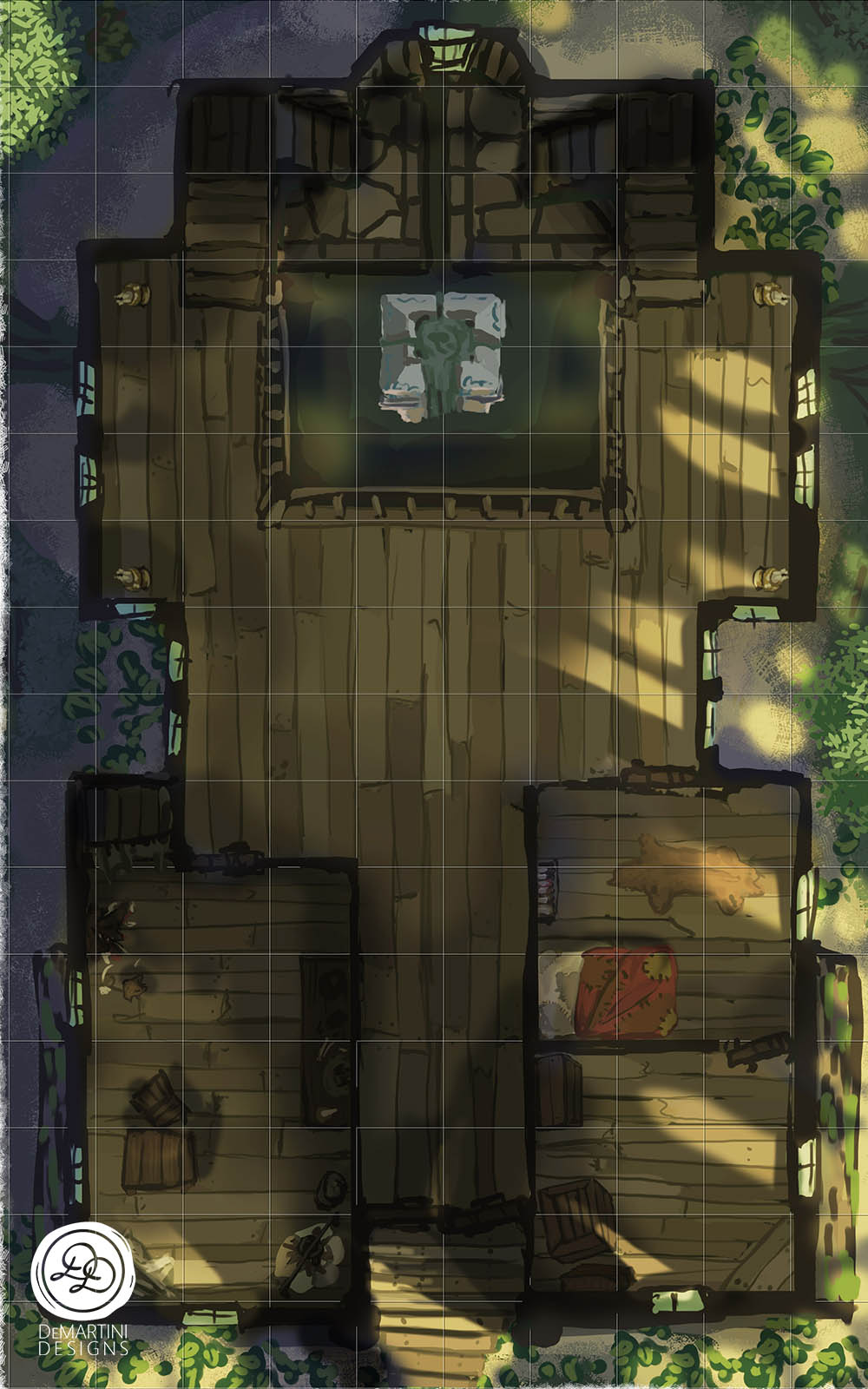 A large wooden building, clearly hand made, but impressive in its exterior complexity, sits on a patch of earth threatened to be drowned by the surrounding swamp. The top half is bulkier than the bottom, with multiple windows and overhangs resting across the irregular shape of the nearly windowless ground floor. A single staircase, rickety but cared for, ascends to the only entrance, nearly fifteen feet up on the top floor. Whatever is below seems to only be accessible from the inside.