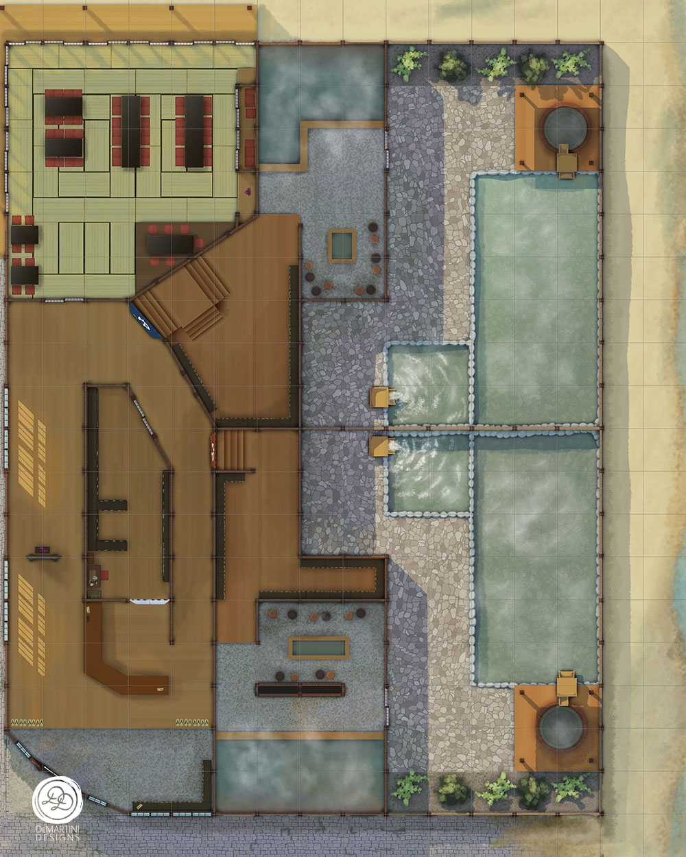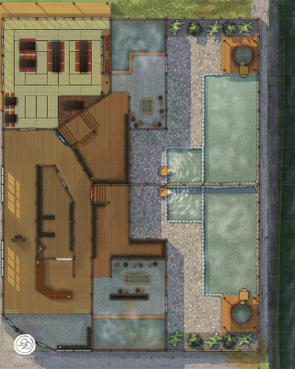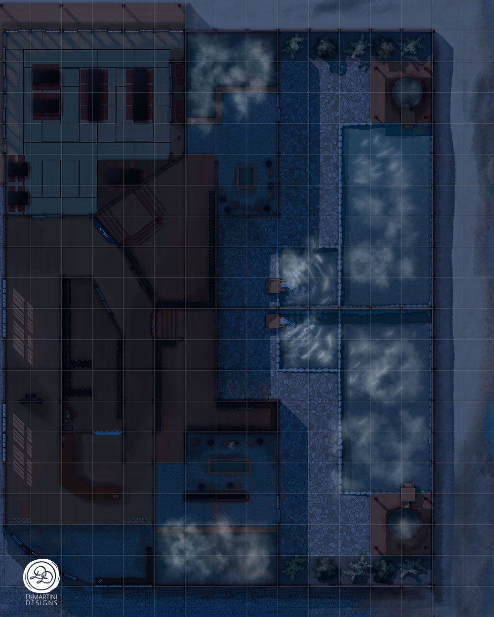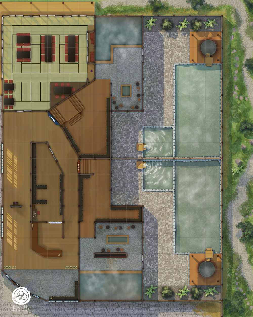 The scent of minerals and sulfur wafts through the streets where many bath houses are built together. Over the fenced courtyards the splashing of water can be heard and puffs of occasional steam peek over the edge, beckoning all to stop and relax a moment.