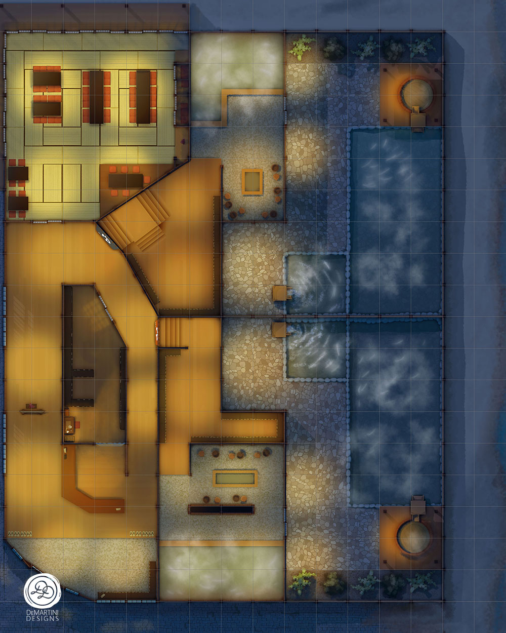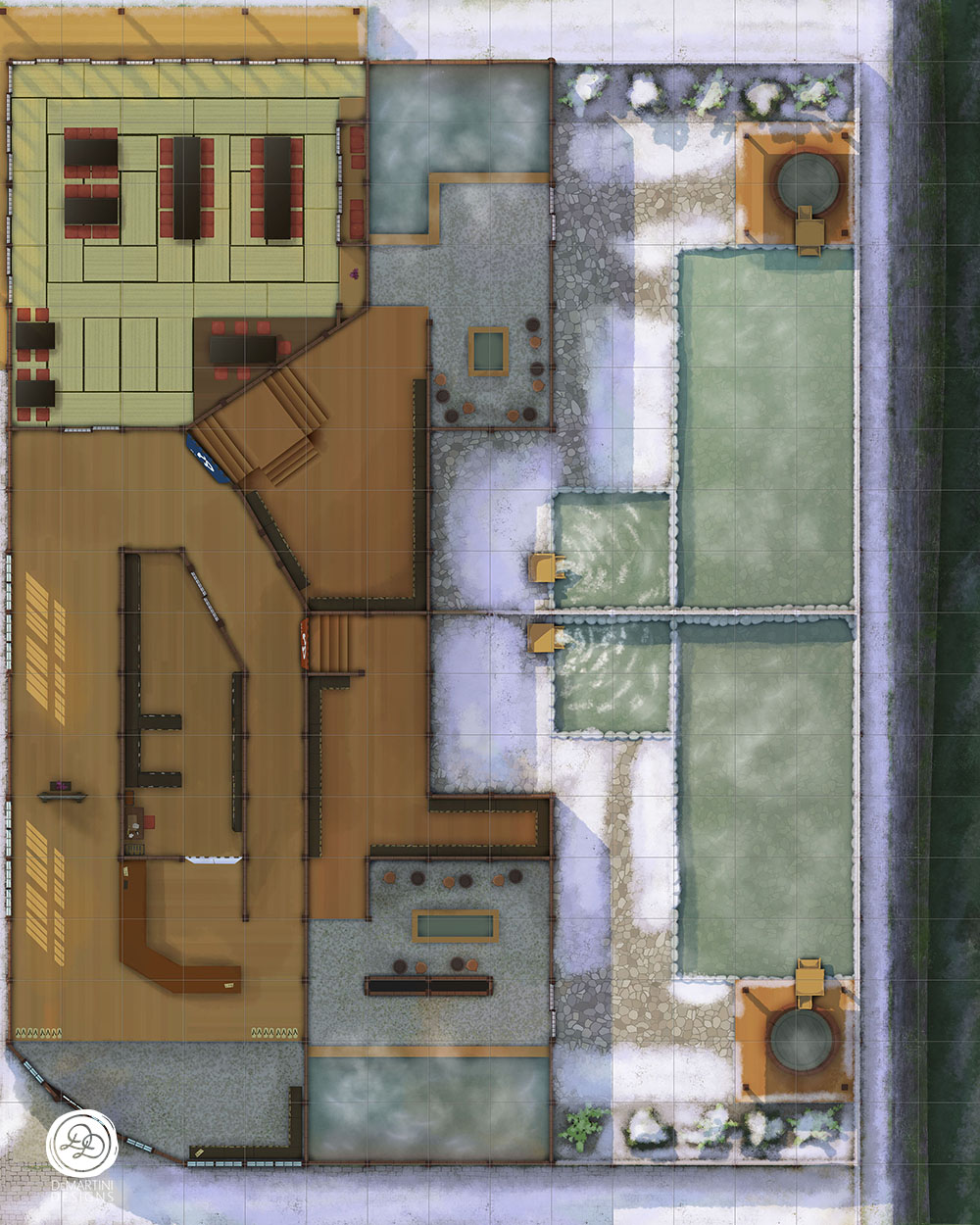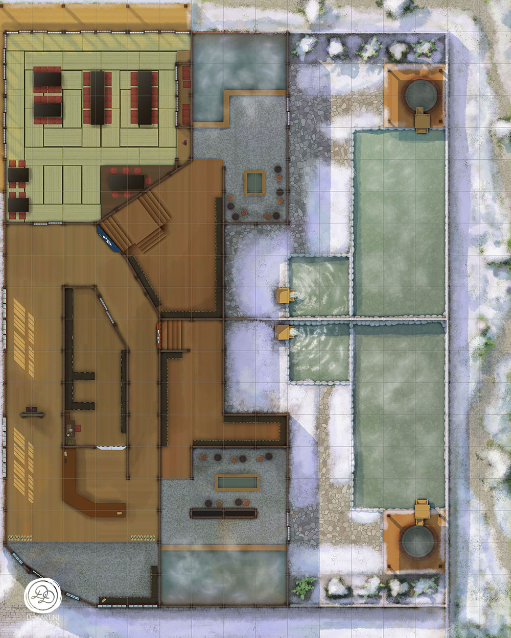 The scent of minerals and sulfur wafts through the streets where many bath houses are built together. Over the fenced courtyards the splashing of water can be heard and puffs of occasional steam peek over the edge, beckoning all to stop and relax a moment.