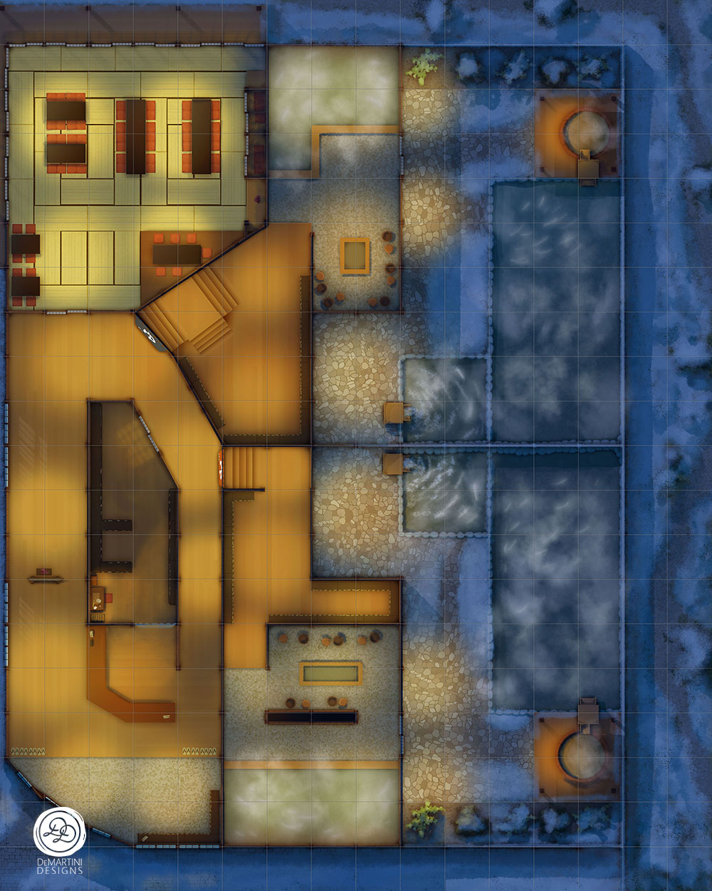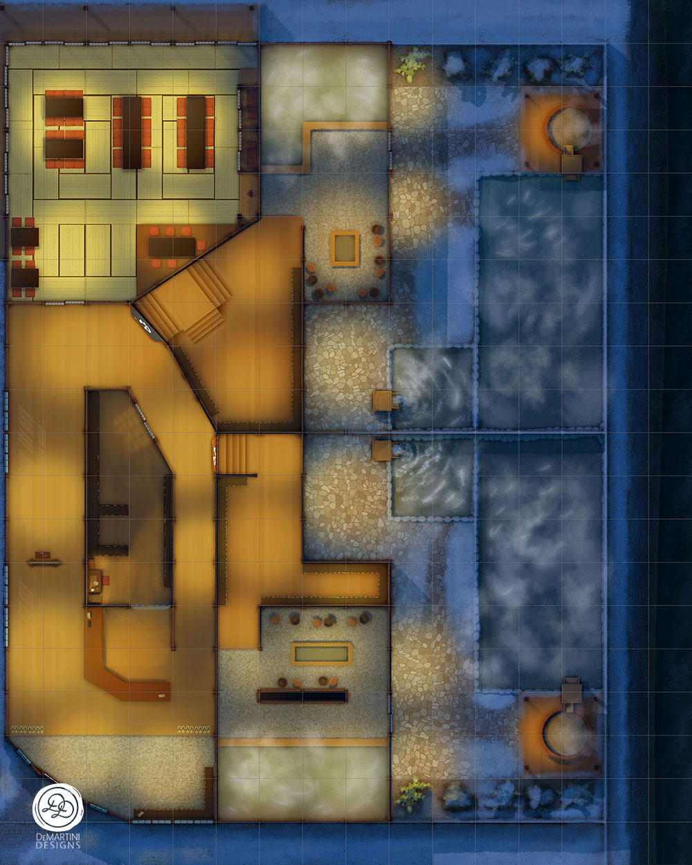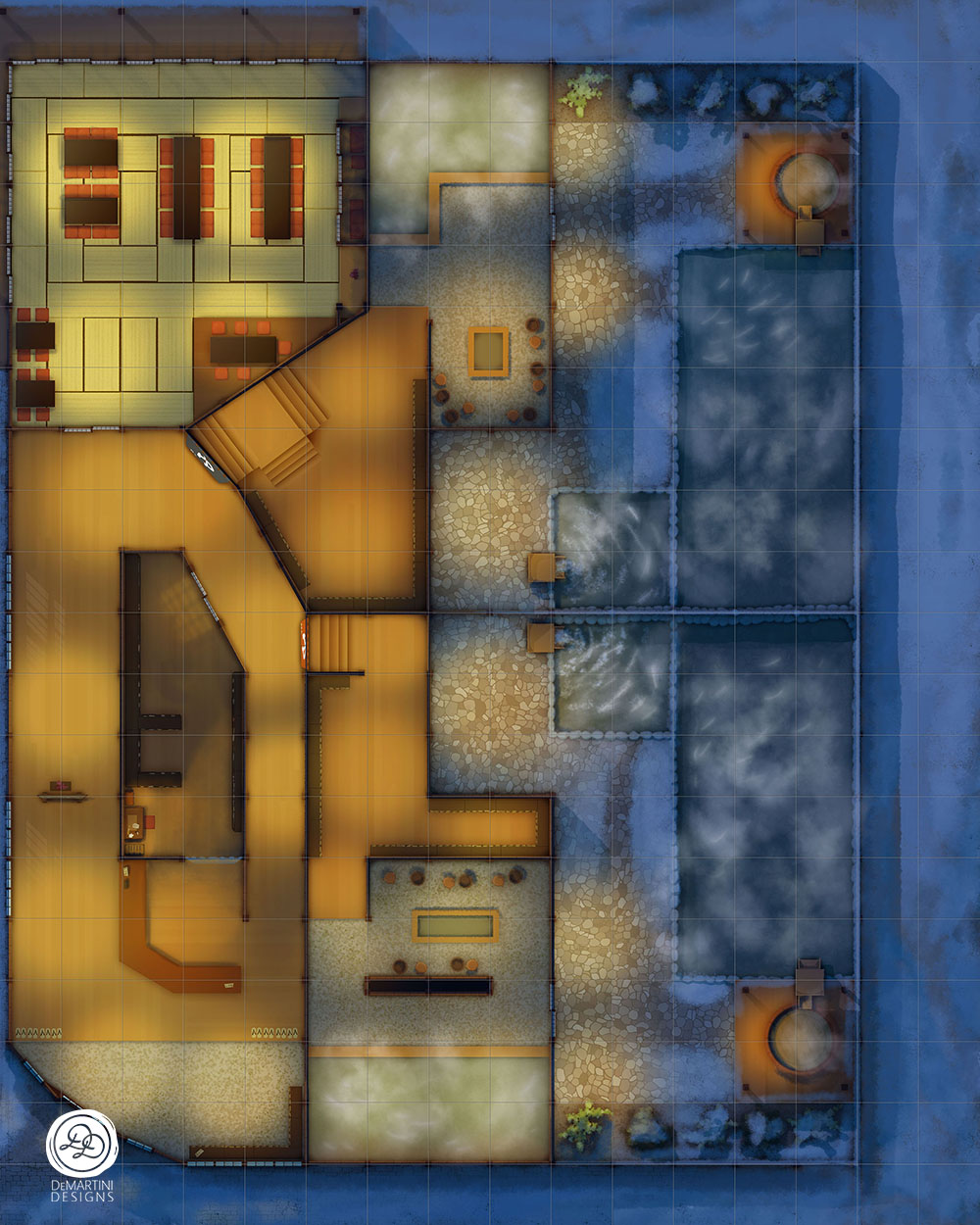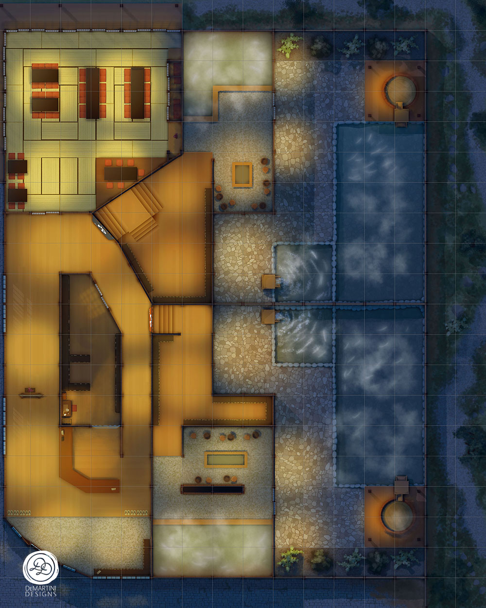 The scent of minerals and sulfur wafts through the streets where many bath houses are built together. Over the fenced courtyards the splashing of water can be heard and puffs of occasional steam peek over the edge, beckoning all to stop and relax a moment.