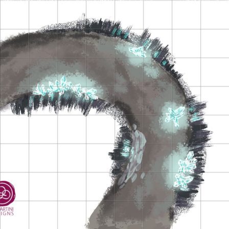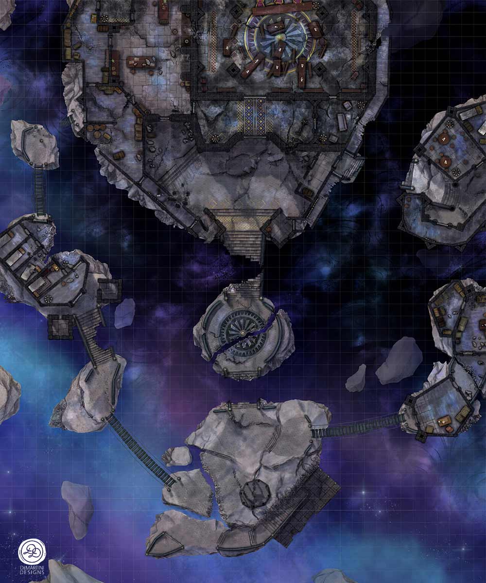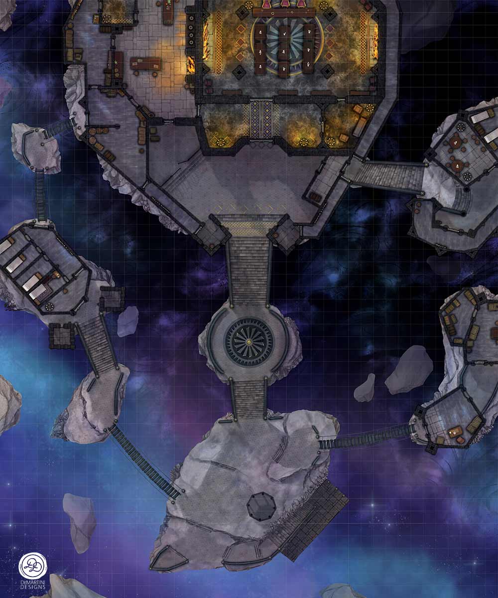 Black marble stairs and iron bridges masquerade as luxurious walkways between paved boulders in the sky. The gates of a turreted, walled courtyard stand open, taunting entry for the brave. Does the interior hold a warm hearth for those invited, or cold ruins for intrepid explorers?