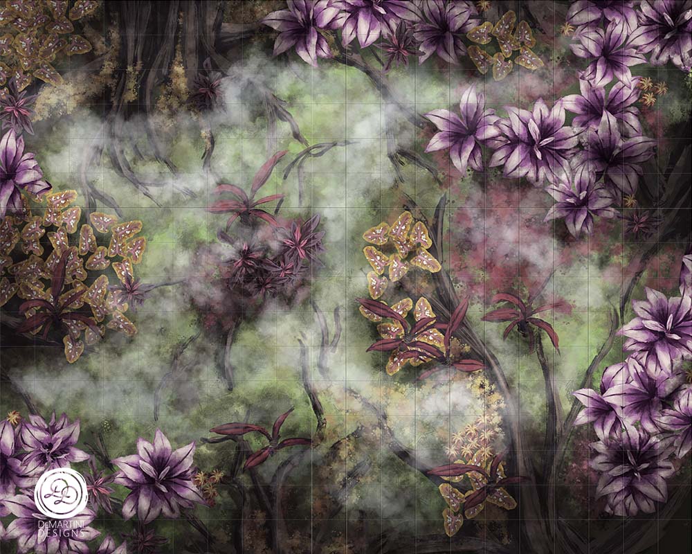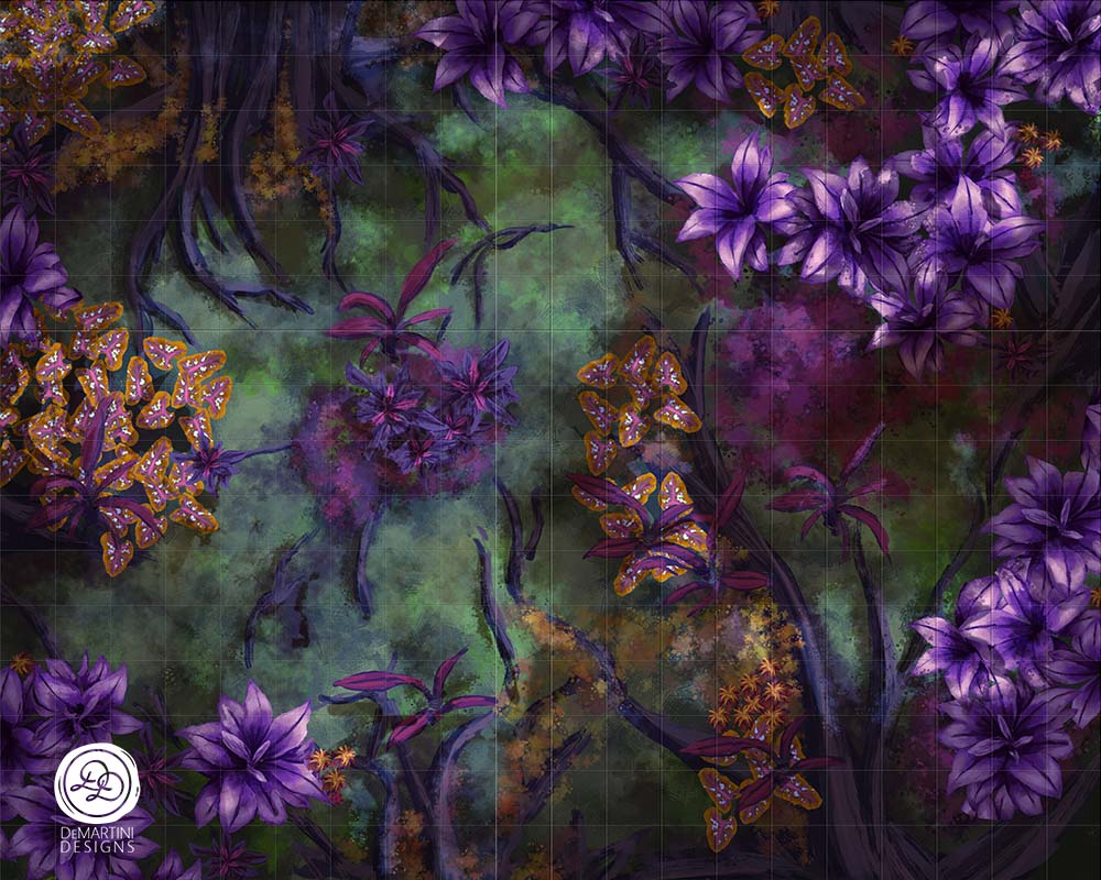 Vibrant green moss springs back below your feet. You brush a large purple leaf out of your way, careful to step around sunny orange and red flowers. Everywhere you look is lush and bright. There's life all around. Probably where you can't see, as well.