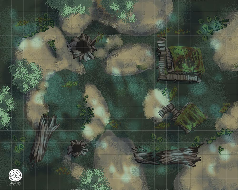 Swamp Hut Clearing 20x16, TWO LEVELS Decide if the water is shallow and noise liability, deep and rough terrain for your players, and if the shacks are abandoned. Day Night Details Map Size 20 x 16 units Map Versions Day Night All maps come with gridded and gridless versions. Where to Find this Map Gumroad (free) Patreon - Reality Bender Patreon - Dungeon Delver Patreon - Scout More Like This Sandbar Islands Terrain Hidden Crumbling Ruins Terrain General Stone Ruins Road, Terrain Skip back to main navigation